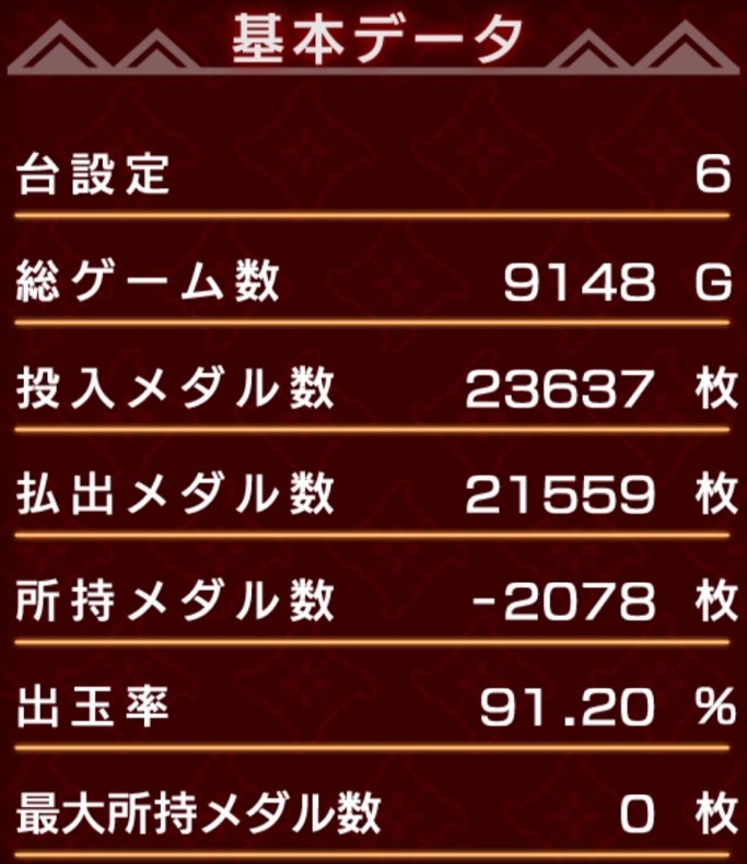 スマスロ モンハンライズの設定6、9148G -2078枚終了のデータです。