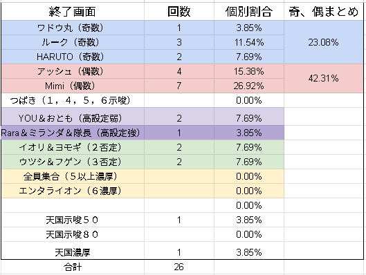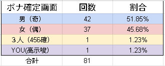 やっぱり1日単位で見ていくとボーナス確定画面の男女比(奇数偶数)ゎあんまりあてにならなさそう、、偏る日もあるけど、結構どっちつかずだったり今回みたいに偶数なのに奇数によっちゃうとかもあるので、結構な偏りがない限り無視でよさそーって感じましたね。