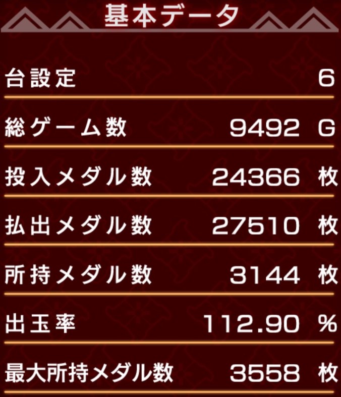 スマスロ モンハンライズの設定6、9492G +3558枚終了のデータです。