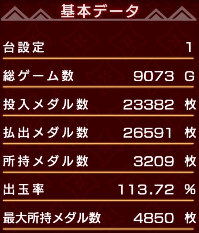 スマスロ モンハンライズの設定1、9073G +3209枚終了のデータです。